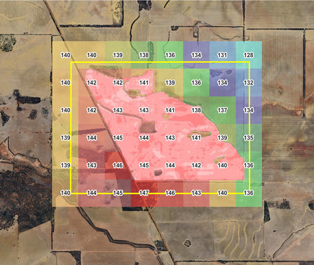Figure: Detailed image from Rainfall Mapper of a paddock in Kalannie WA (Jan-May 2024 summed rainfall). |
