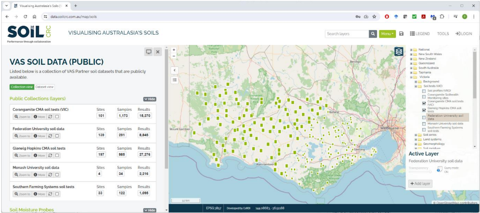 Soil-health data from the Corangamite and Glenelg Hopkins CMAs and other partners are federated into VAS. The datasets include over 200 monitoring sites sampled at set depths since 2015. For privacy, locations are randomised while still enabling users to chart soil-property trends and compare repeated observations through the VAS portal. | ||