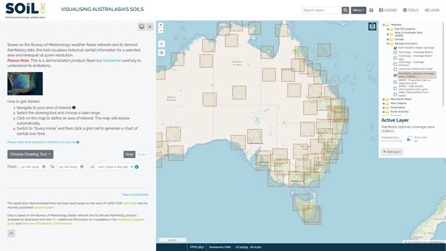 This demonstrator tool provides access to weather data mapped to regions and soil types across Australia. The data is based on the Bureau of Meteorology weather Radar network derived Rainfields3 data. Using this tool the historical rainfall information for a selected area, and timespan, mapped to 500m resolution can be visualised. Accessing rainfall data to a selected region provides a visual representation of rainfall patterns, highlighting variations in rainfall intensity over time. This Tool offers a reliable estimate* of the distribution of soil moisture in the soil at the sub-paddock scale.